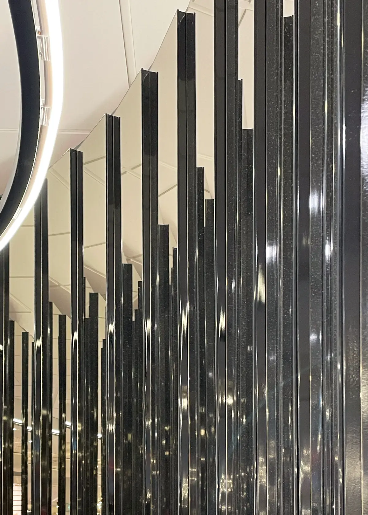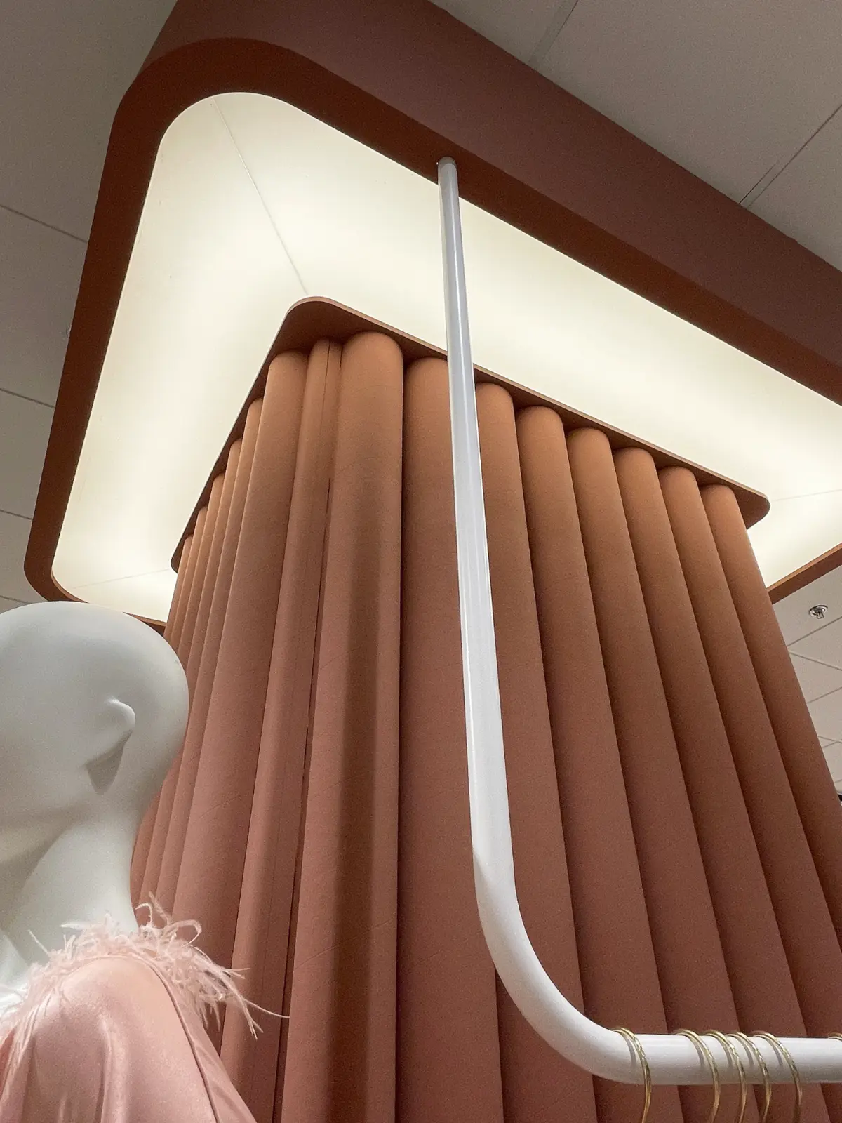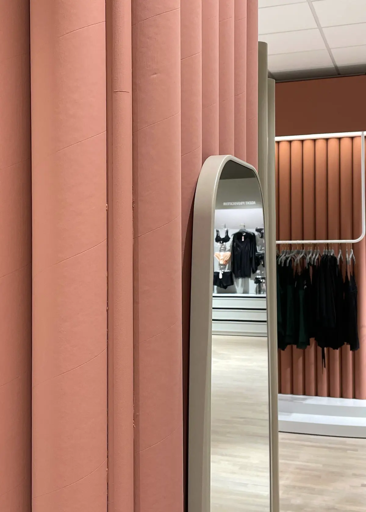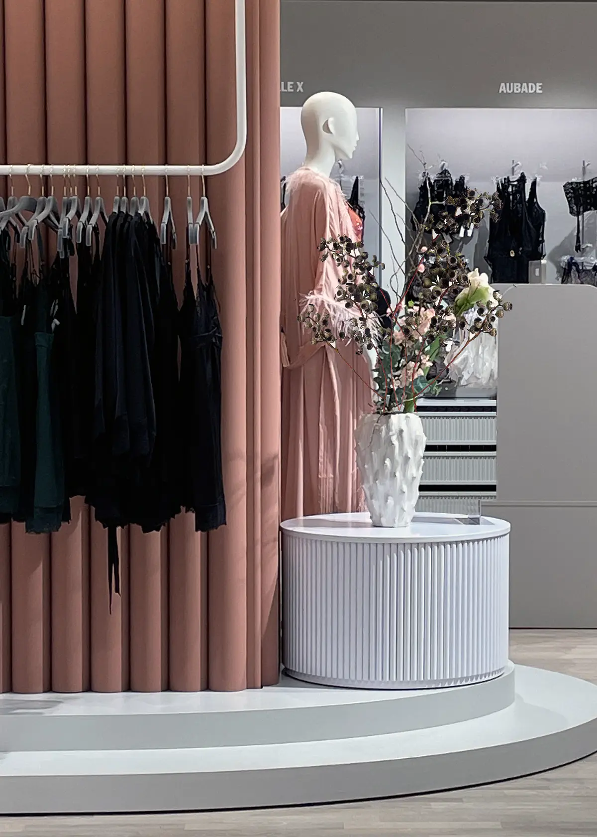 The main interior features include terracotta-toned tubular pillars, hardwood flooring, and soft grey accents. The space is dedicated to women and draws inspiration from the concept of le boudoir—a beautifully decorated sitting room once used for dressing, relaxing, and intimate gatherings.